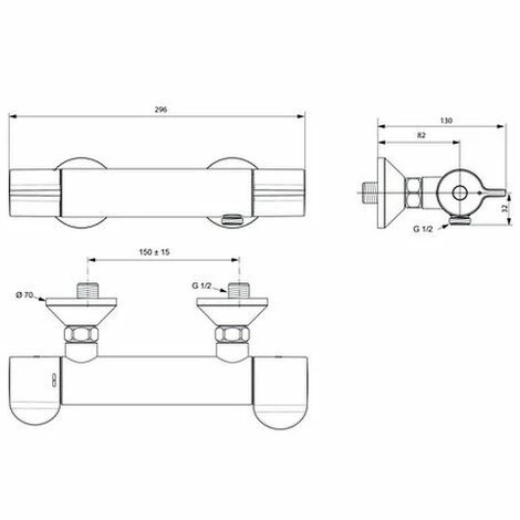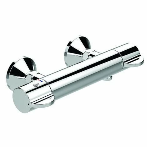 Brausethermostat AP, DN 15. Cool Body. Für thermische Desinfektion geeignet, mittels mitgeliefertem Spezialwerkzeug. Rückflussverhinderer. DVGW Eigensicher. Bedienungsgriffe aus Metall, mit permanenter Rot/Blau Markierung. Absperrung mit keramischen Obe