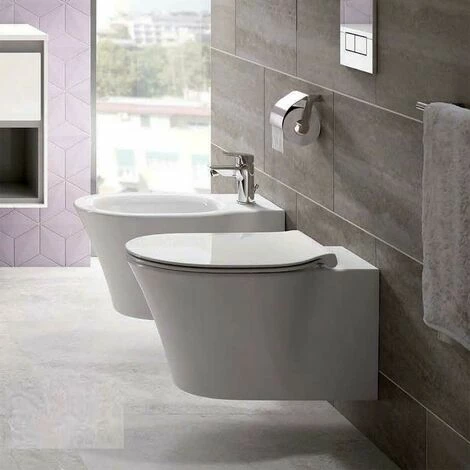 Die neue Kollektion hängender Sanitärkeramik von Ideal Standard, Modell Connect Air, ist heute die ideale Lösung für alle hängenden Badezimmer. Die Sanitärarmaturen der Linie Connect Air zeichnen sich durch elegante Linien und dünne Kanten aus. Die hängende Toilette und das Bidet sind mit besonderem Augenmerk auf Linien gefertigt und bieten besonders elegante Formen, die für alle modernen Badezimmerumgebungen geeignet sind. Die Toilette ist vom neuen idealen AquaBlade-Standardsystem, das einen ästhetisch sehr sauberen und eleganten randlosen Toiletteninnenraum bietet. Darüber hinaus wird das wandhängende WC Connect Air mit dem neuen schlanken duroplastischen Sitz angeboten, der auch mit Absenkautomatik angefordert werden kann.