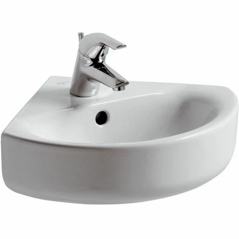 Eckwaschtisch aus Feinfeuerton. Armaturenbank: 1 Hahnloch mittig durchgestochen. Befestigung mit 2 Stockschrauben M12 x 150 mm (K710867). Norm: DIN EN 14688 CL 10, DIN EN 31 Farbe: Weiß (Alpin) Außenmaße (BxTxH): 480x440x160 mm Innenbecken (BxTxH): 330