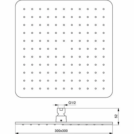 Regenbrause 300 x 300 mm aus Metall. Anti-Kalk-Funktion. Durchfluss: 12 l/min.. Höhe der Brause 8,5 mmit Anschlussgewinde G1/2. Kopfbrause mit Kugelgelenk, 10 Grad schwenkbar. Oberfläche: Chrom Gesamte Ausladung (BxAusld.xH): 300x300x52 mm Hersteller: I