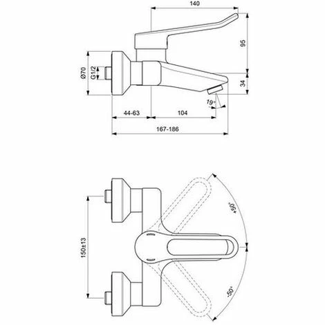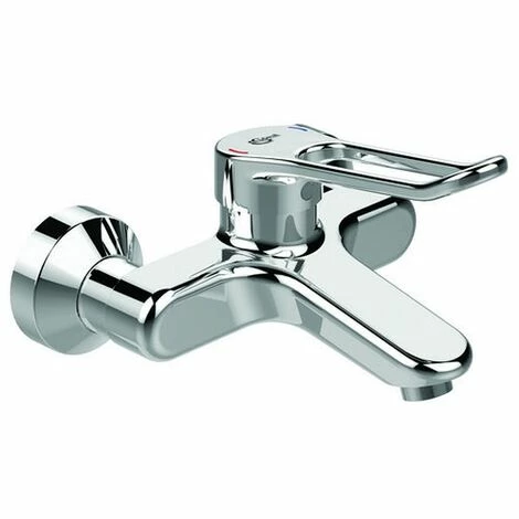 Einhebel wand-Waschtischarmatur, DN 15, mit Bügelhebel 140 mmit Starrer selbstentleerender, nickelfreier Auslauf, mit vandalensicherem Strahlbrecher (Aerosolarm). Ausladung 148-167 mmit Bedienungshebel aus Metall, Länge 140 mm, mit permanenter Rot-/Blau