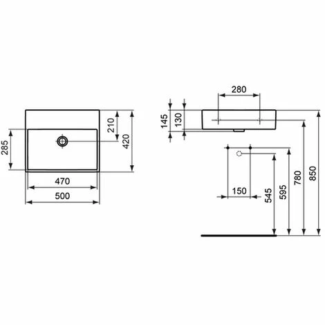 Waschtisch aus Feinfeuerton. Armaturenbank: Ohne Hahnloch. Befestigung mit 2 Stockschrauben M10 x 140 mm (K710767). Norm: DIN EN 14688 CL 20, DIN EN 31 Oberfläche: Weiß (Alpin) mit Ideal Plus Außenmaße (BxTxH): 500x420x145 mm Innenbecken (BxTxH): 470x