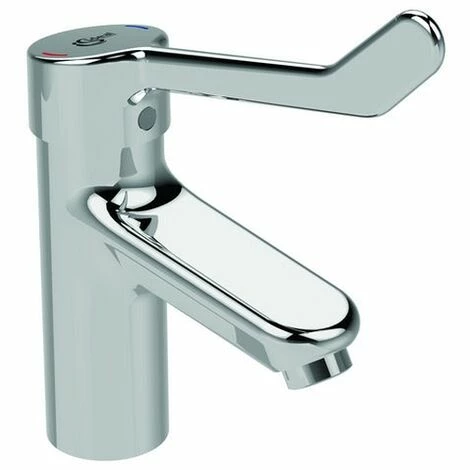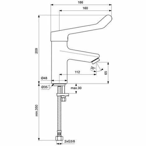 Einhebel Waschtisch-Armatur DN 15 mit Klinikhebel 160 mmit Starrer selbstentleerender, nickelfreier Auslauf, mit vandalensicherem Strahlbrecher (Aerosolarm). Ausladung 112 mmit Auslaufhöhe 65 mmit Nickelfreie flexible Anschlussschläuche. Bedienungshebel